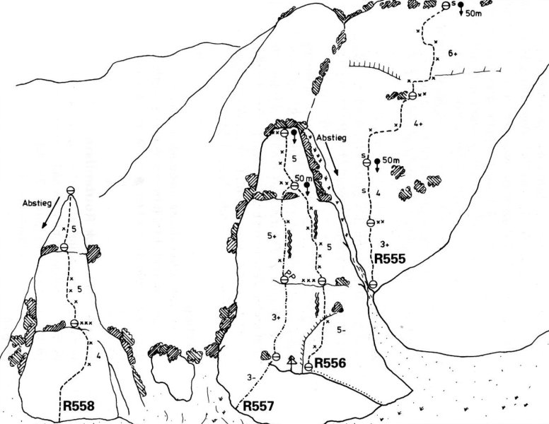 In dieser letzten linken Plattenzone der Mattstock Südostwand, bevor diese in den Vorderen Mattstock übergeht, finden wir einige lohnende Routen. Auffällig ist eine vom Wasser zerfurchte, dreieckige Platte. |